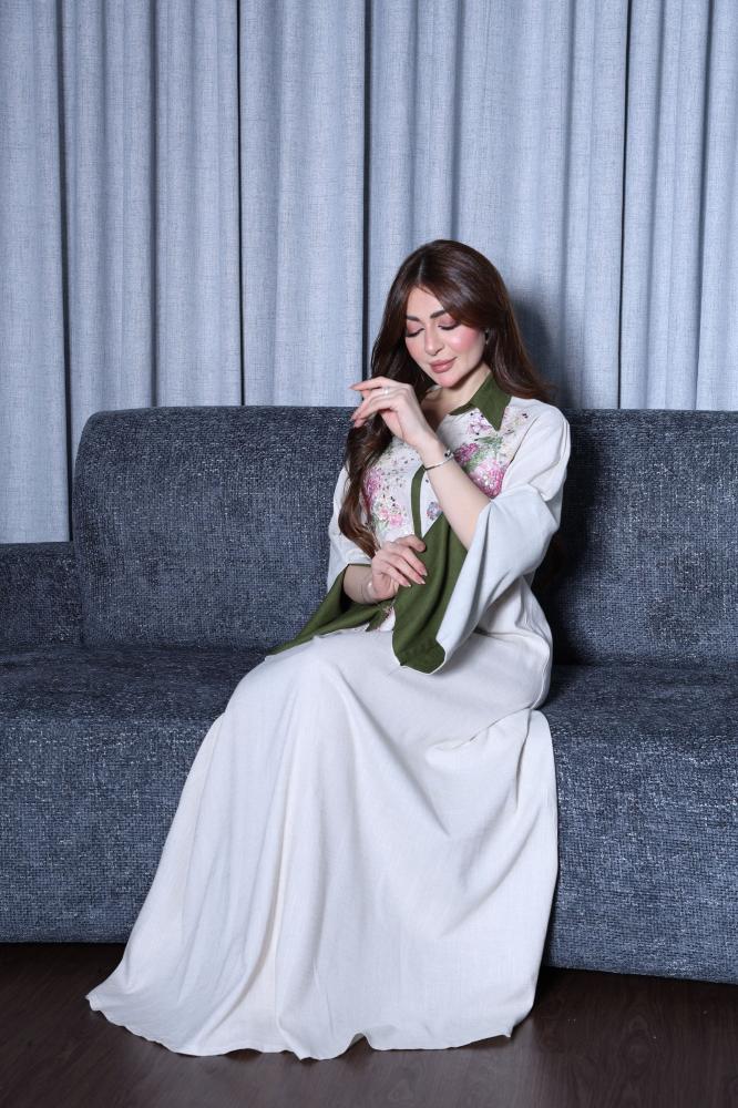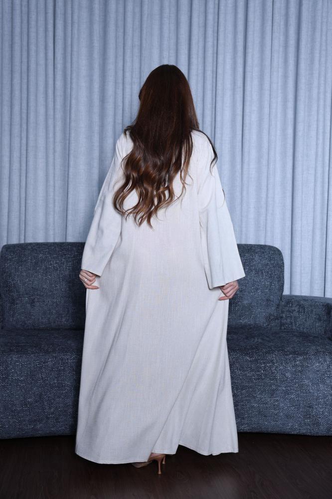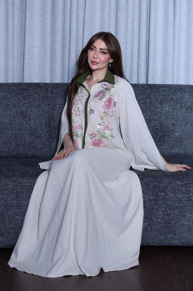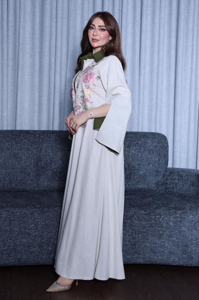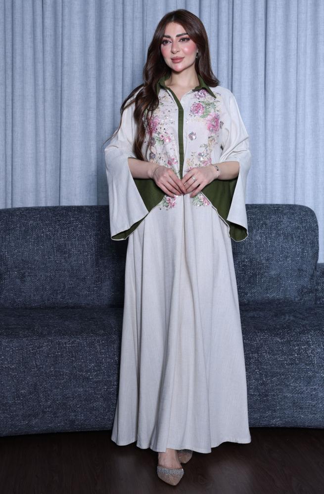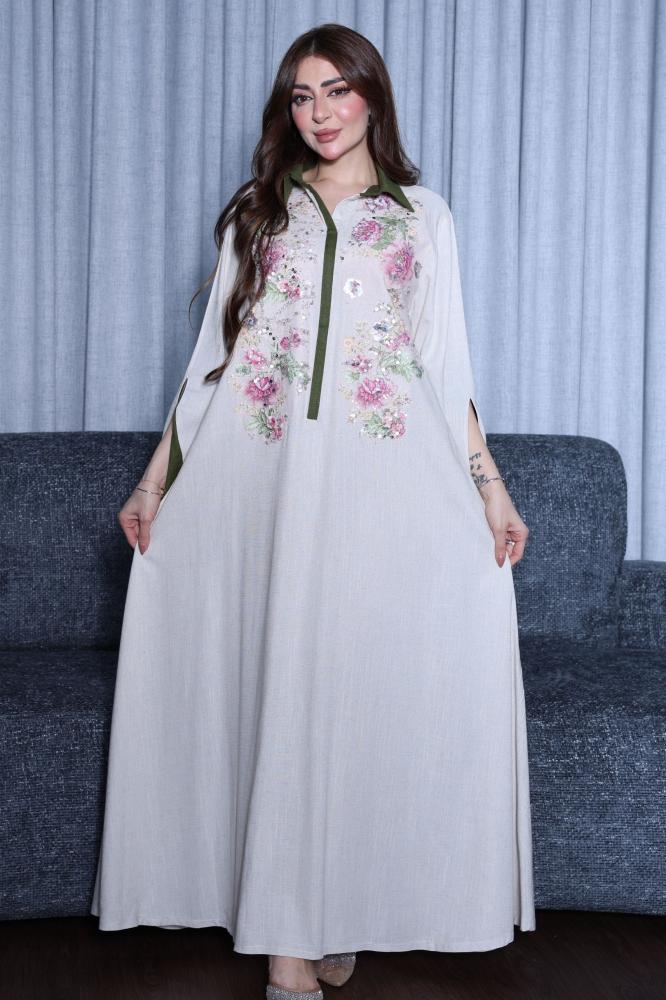 اختاري جلابية بورد لينن قلاب بكلفة مطرزة في الصدر وكوني عنوان الأناقة الشرقية العصرية في كل مناسبة!