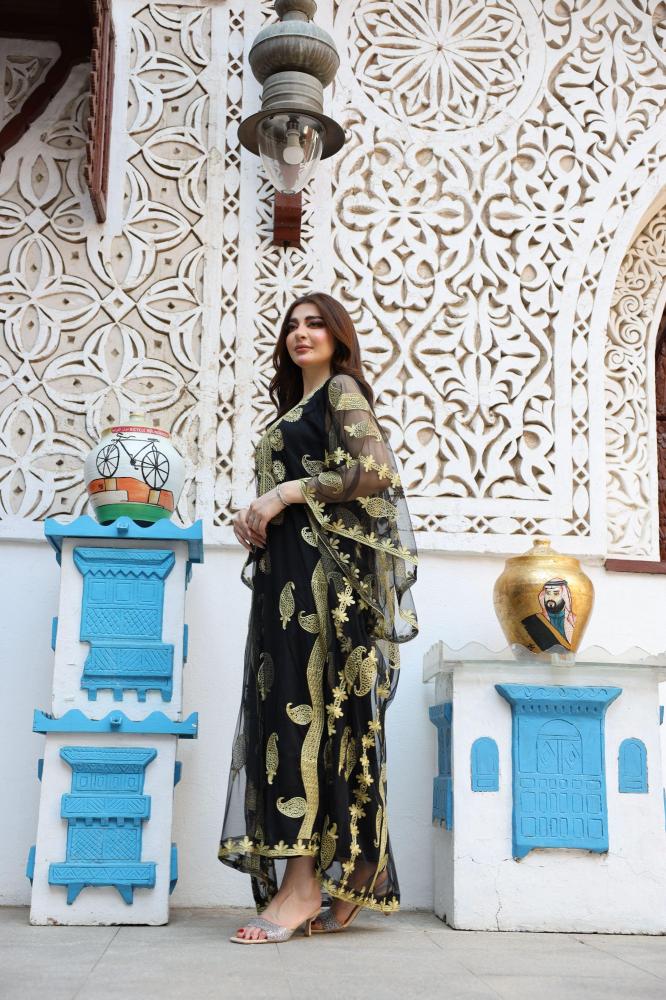• الخامة: تل فاخر شفاف مع تطريز يدوي ذهبي متقن يعكس الحرفية العالية والتفرد.