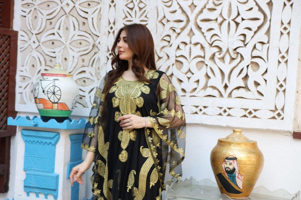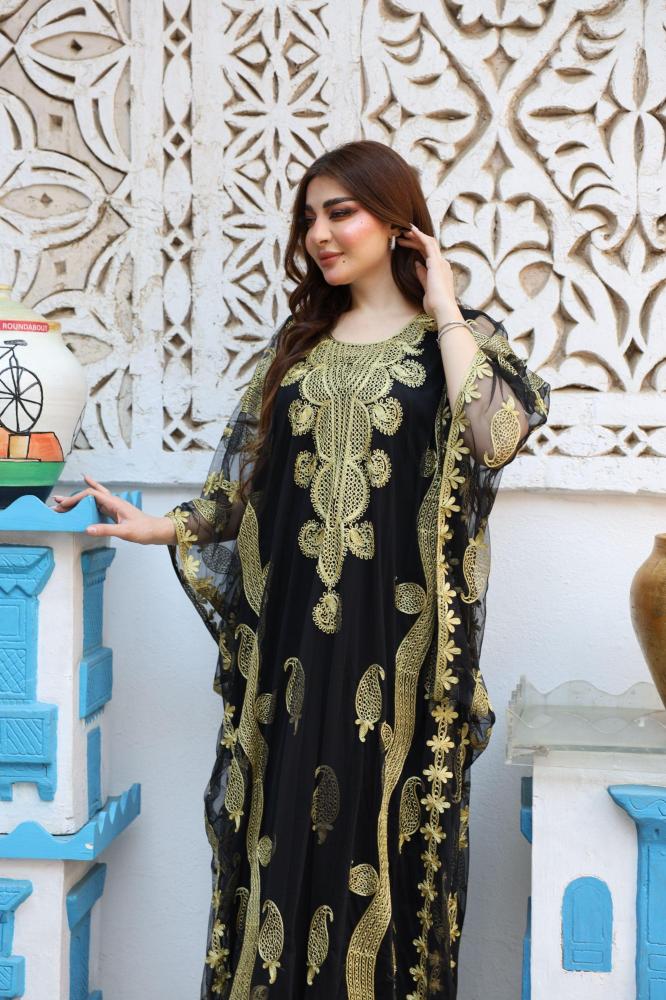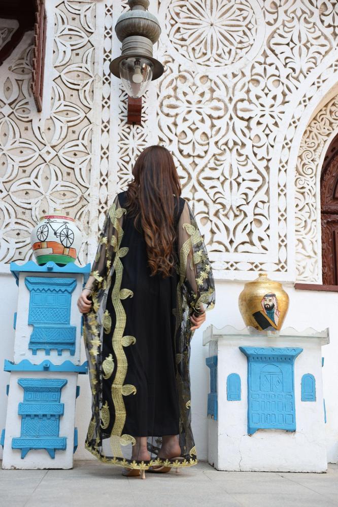 • تطريز يدوي فاخر: تفاصيل تطريز دقيقة بلمسة ذهبية تزيد من فخامة وحصرية الجلابية.