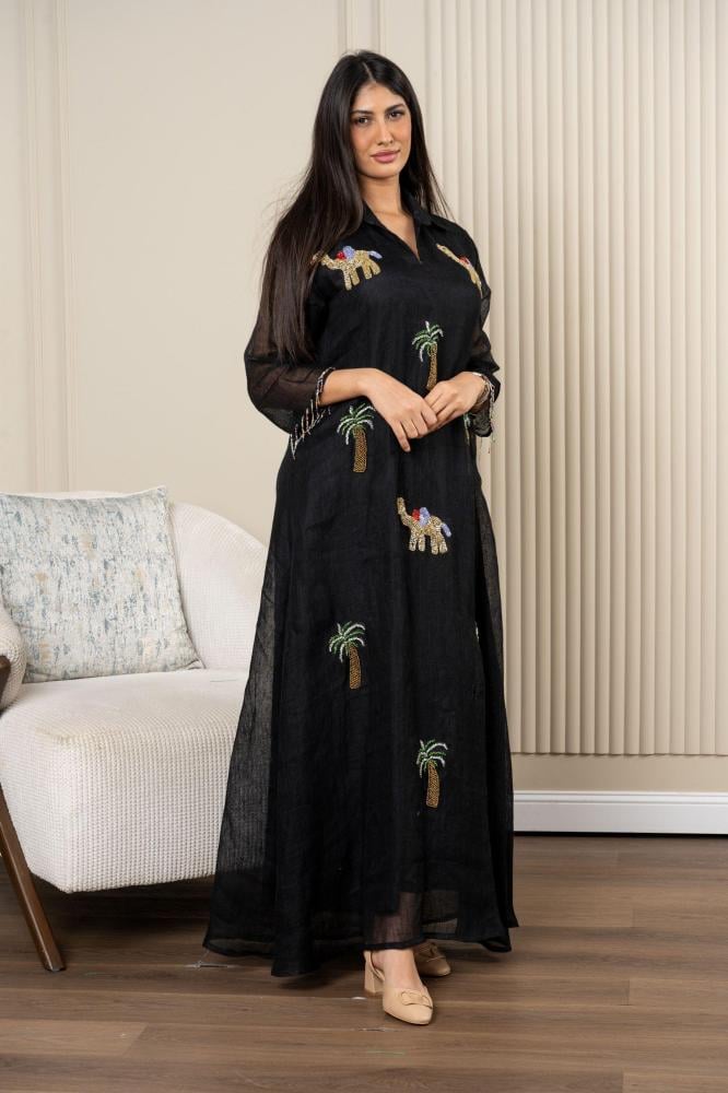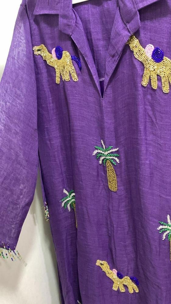 جلابية لينن خيش بتطريز شك نخلة و جمل