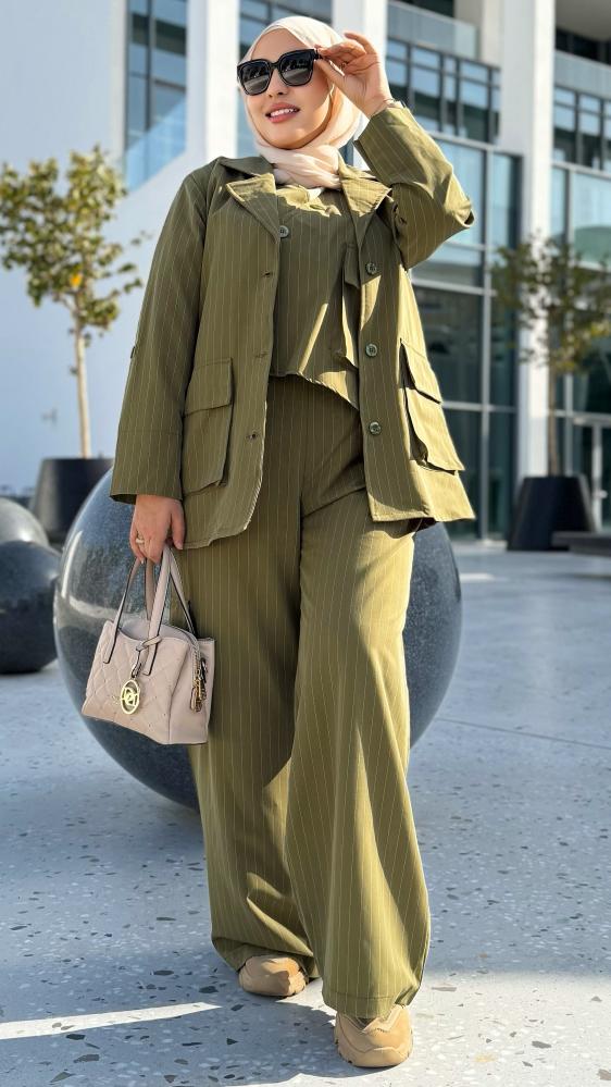 طقم بخامة كريب مقلم بـ 3 قطع وجيوب خارجية
