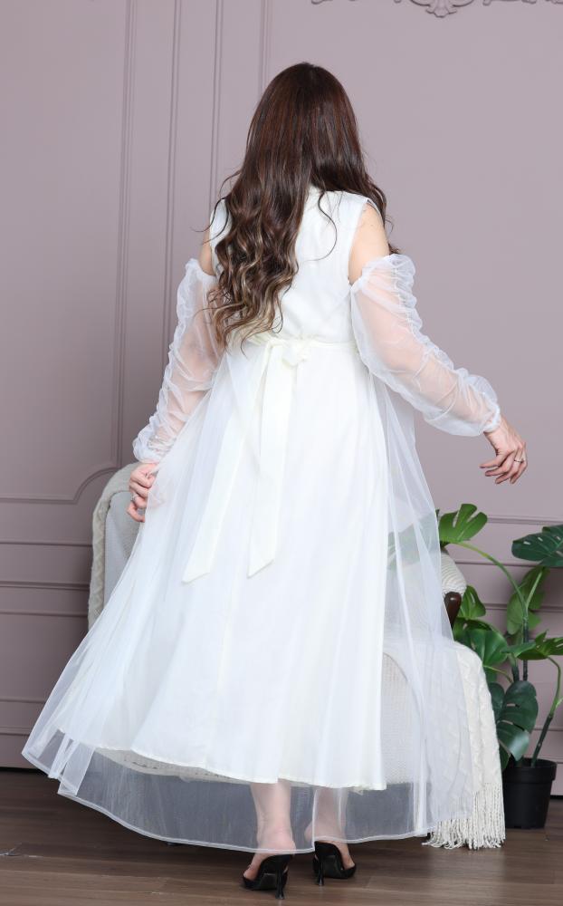- البشت الأبيض الشيفون يتميز بنعومته وأناقة تصميمه مما يضيف لمسة من الرقي إلى الإطلالة.