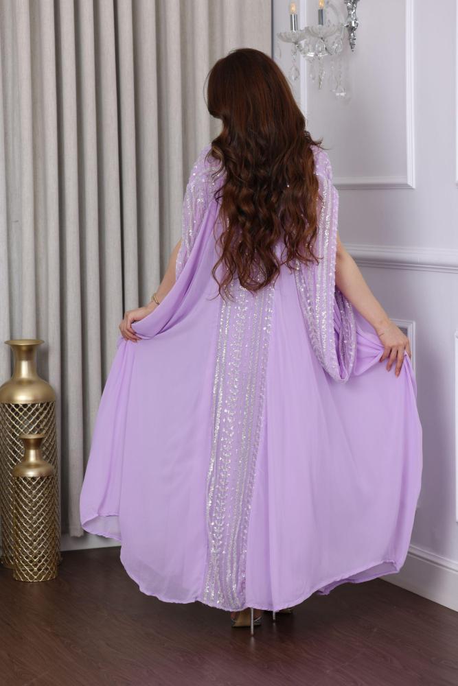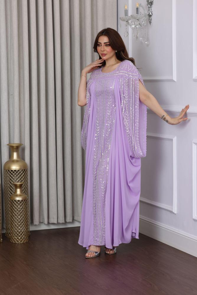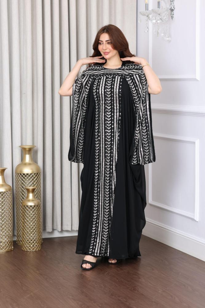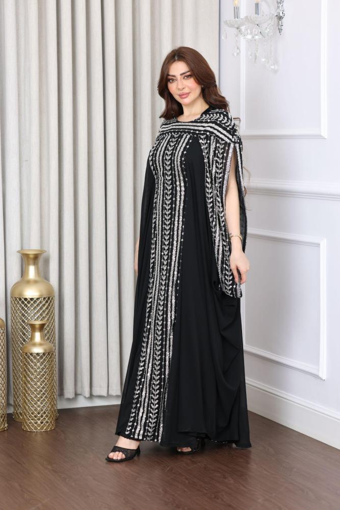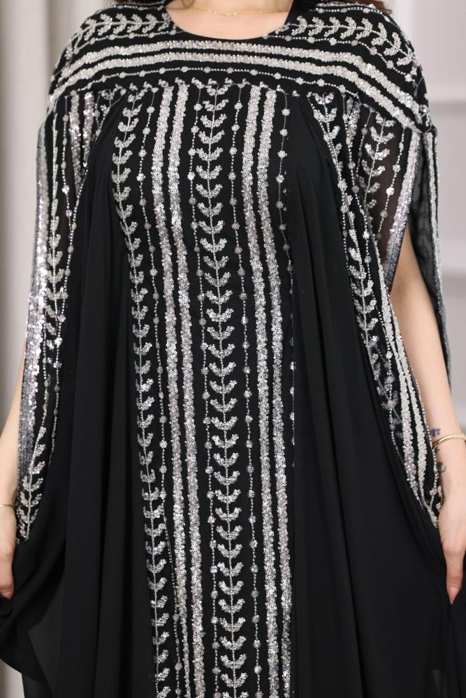 - تفاصيل مطرزة يدويًا على الصدر والأكمام تضفي لمسة فاخرة وتبرز رقي التصميم، مع لمسات لامعة تعكس الضوء وتلفت الأنظار.